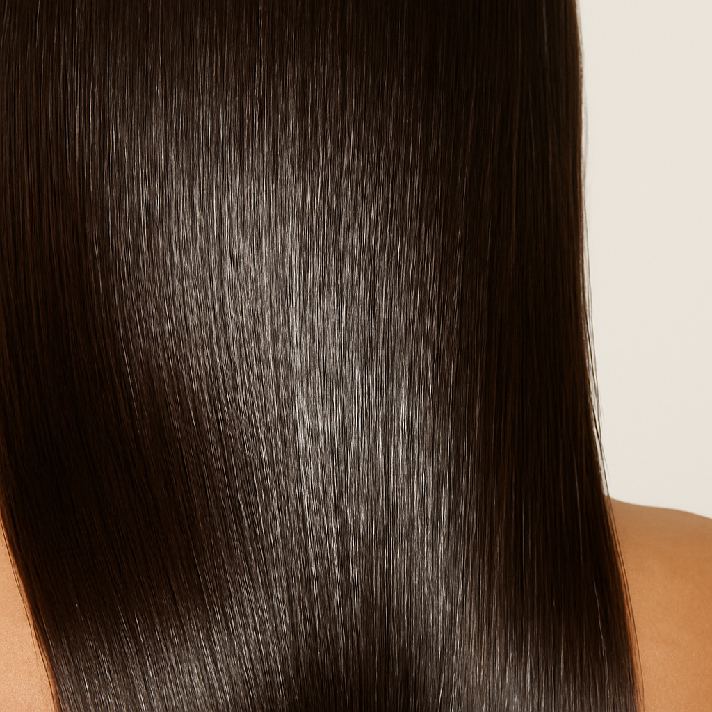 Cutículas selladas y superficie uniforme que reflejan la luz, dejando el cabello con un brillo intenso y saludable.
